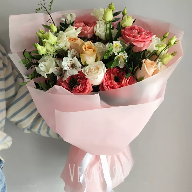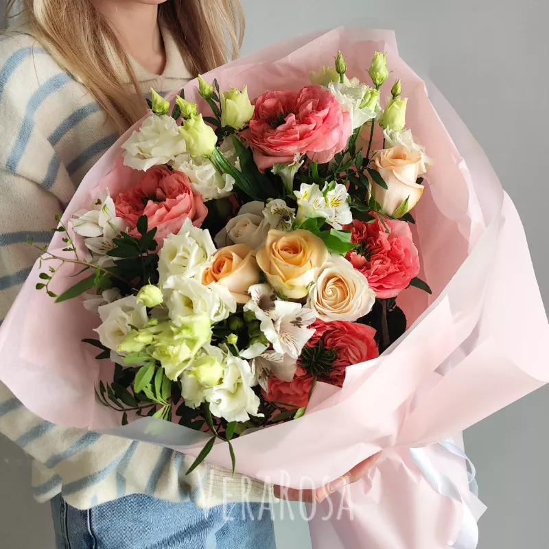 Нежный и романтичный букет, включающий розы персикового и кораллового оттенков, розы и альстромерии белого цвета. Оформлен в мягкую розовую бумагу, создаёт впечатление воздушности и изящества. Этот букет идеально подойдёт для выражения любви и заботы, наполняя пространство теплом и светом.