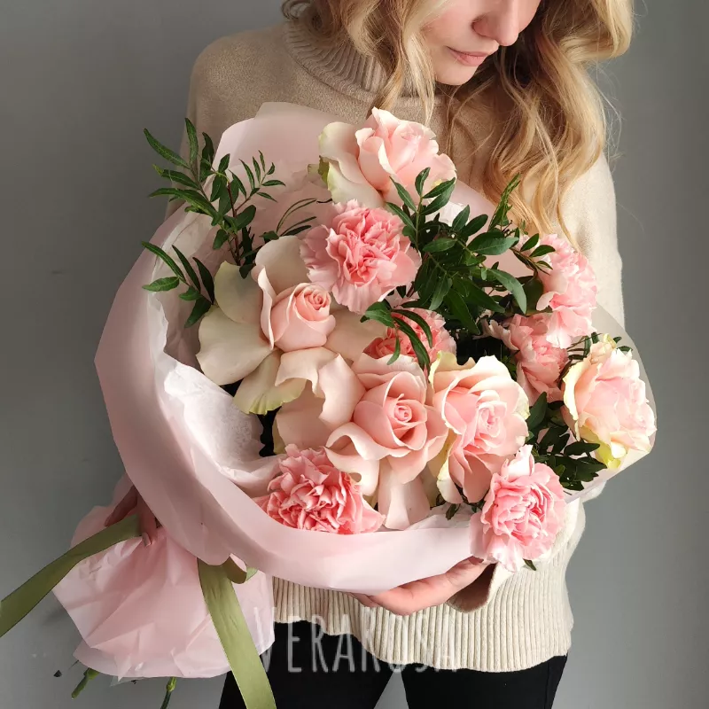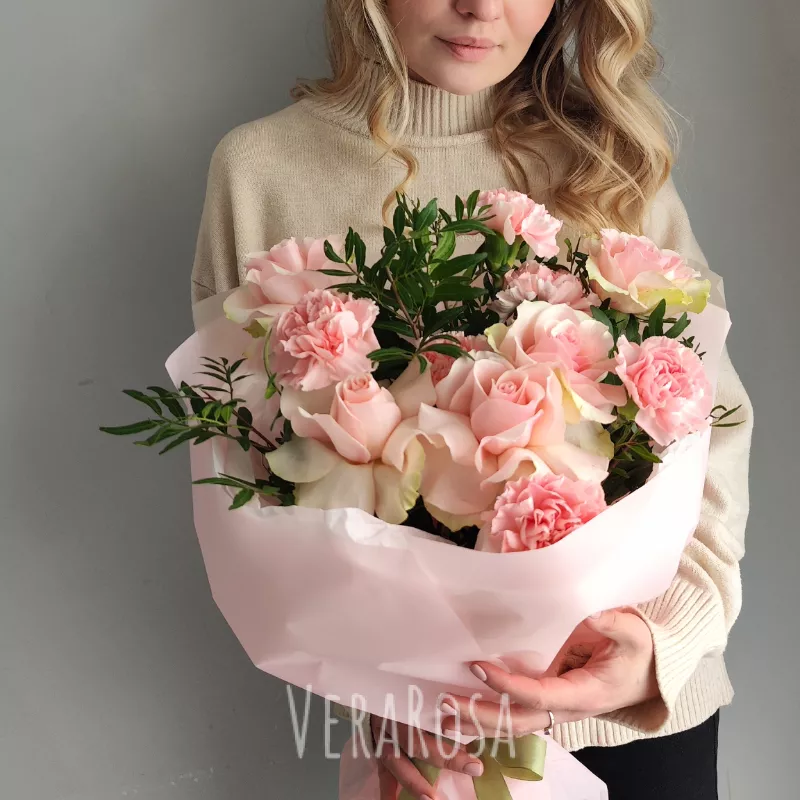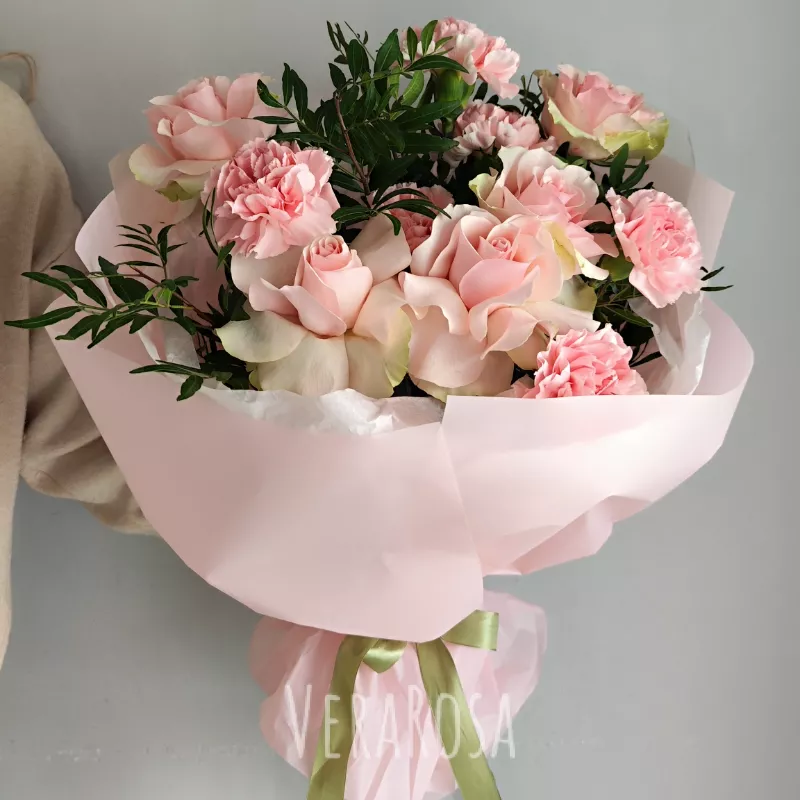 Нежный розовый букет, словно сотканный из летних грёз, станет идеальным выражением вашей любви и внимания. Мягкие оттенки роз и гвоздик переливаются, создавая атмосферу утонченности и романтики. Этот букет прекрасный комплимент, который подарит незабываемые эмоции.