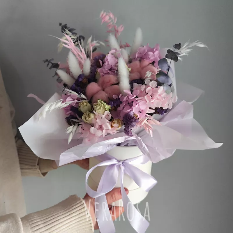 Букет из сухоцветов в нежных оттенках фиолетового и розового. Необычная цветовая гамма и оригинальная форма цветов создают воздушную композицию, наполненную лёгкостью и нежностью. Этот букет станет прекрасным подарком для тех, кто ценит природную красоту и оригинальность.