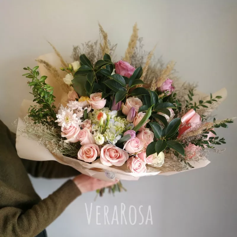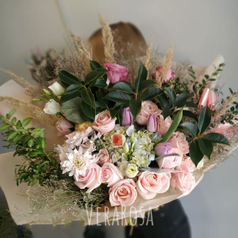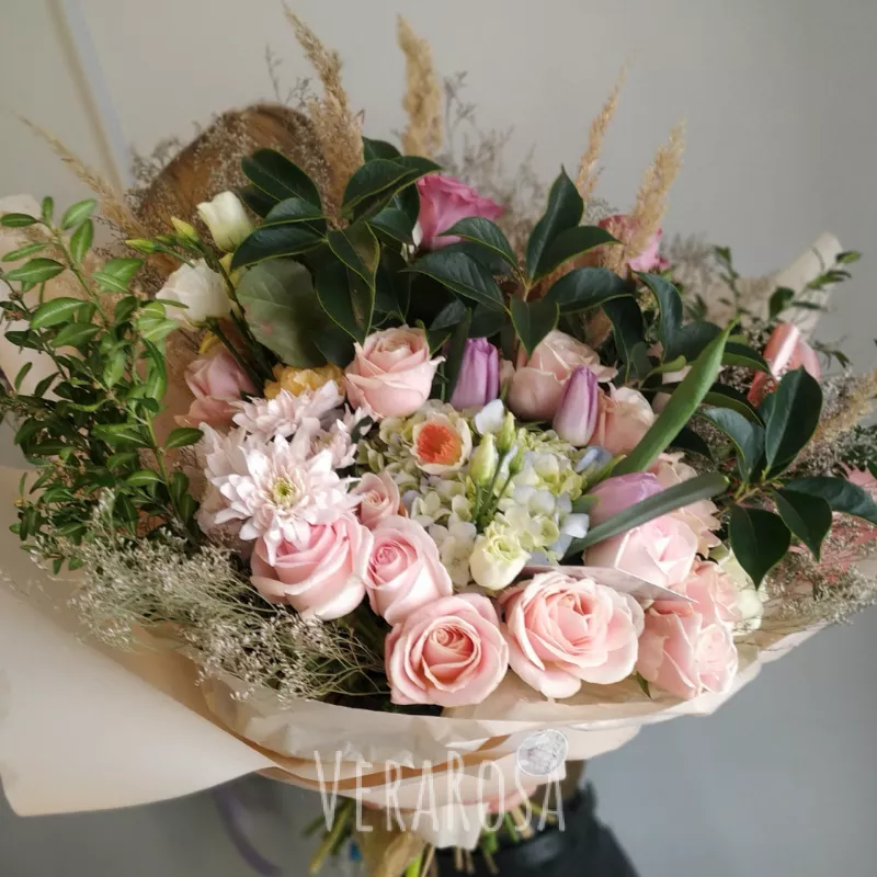 Авторский букет из нежной гортензии, пудровых роз, хризантем,сочной зелени, тюльпанов и веточек сухоцветов. Оформлен в упаковку и атласные ленты.