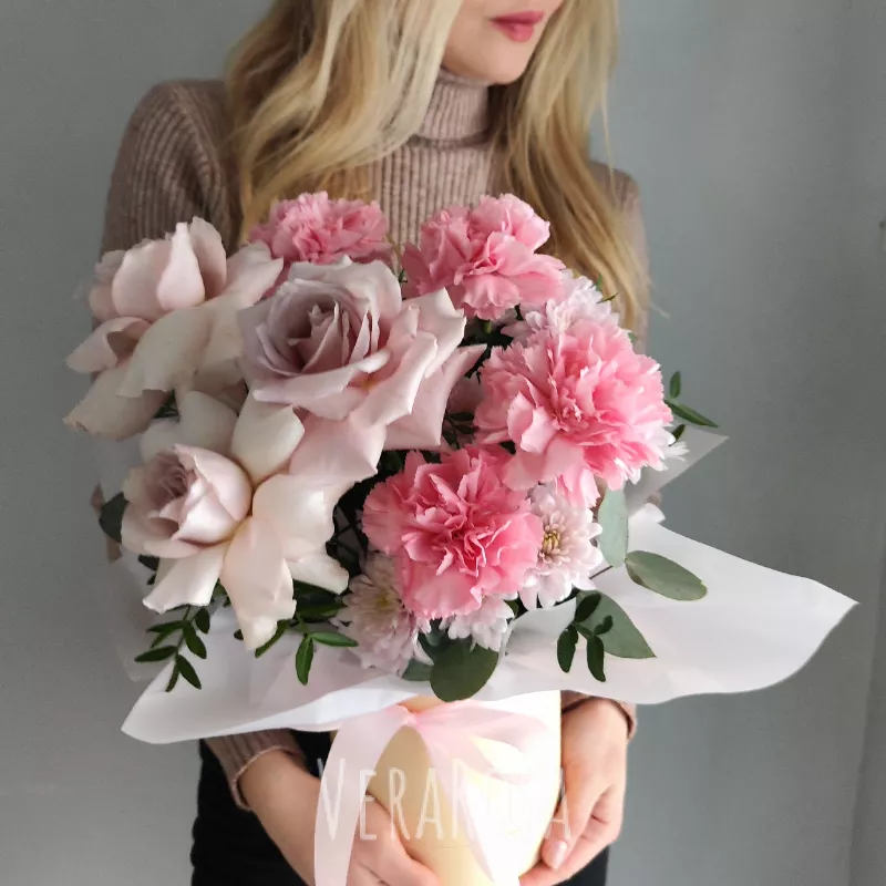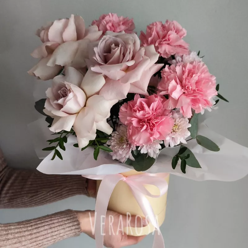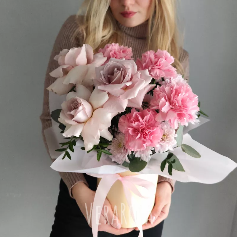 Букет, представленный в нежно-розовой гамме, включает в себя элегантные розы и пышные гвоздики, создавая гармоничное сочетание изысканности и романтичности. Необычная подача в круглой коробке, украшенной шелковой лентой, добавляет композиции изящества и делает её запоминающейся. Этот букет станет прекрасным выбором для выражения чувств и создания праздничного настроения.
