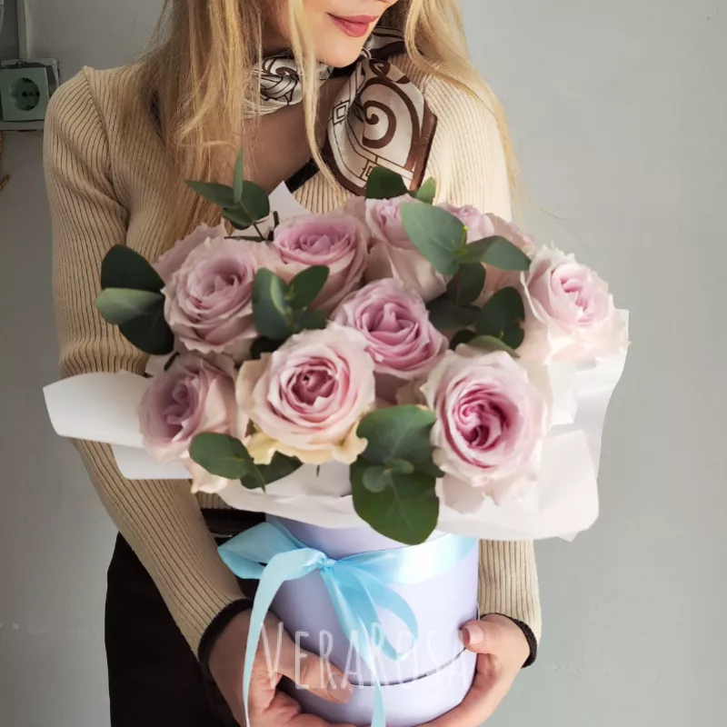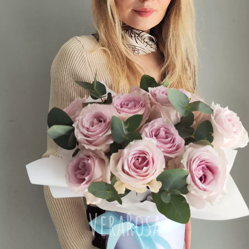 Нежный букет из лавандовых роз, будто созданный для объятий. Этот воздушный подарок, дополненный зеленью эвкалипта, подарит искренние эмоции и подчеркнет вашу заботу.