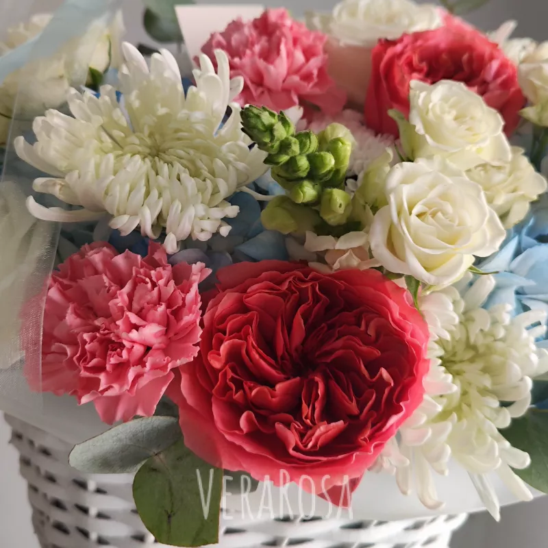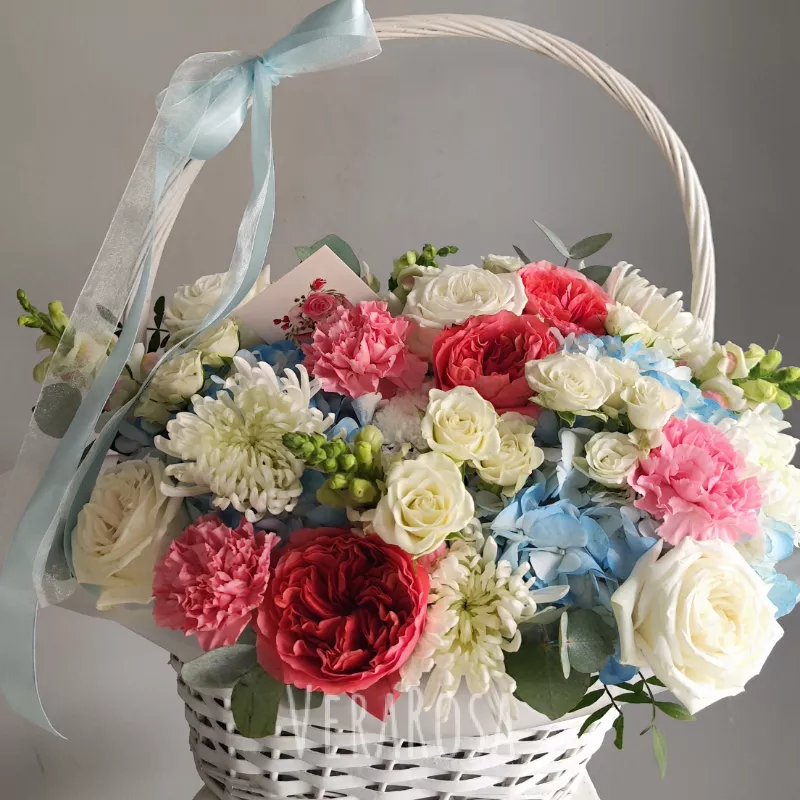 Изящная цветочная композиция в лукошке. Оформлена атласной лентой.