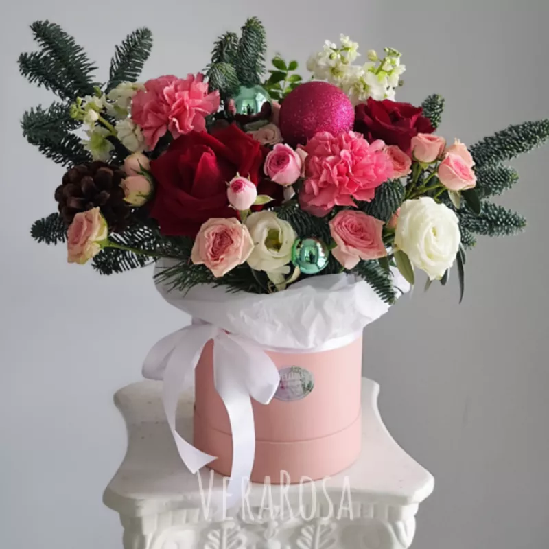 Коробка с елью и цветами