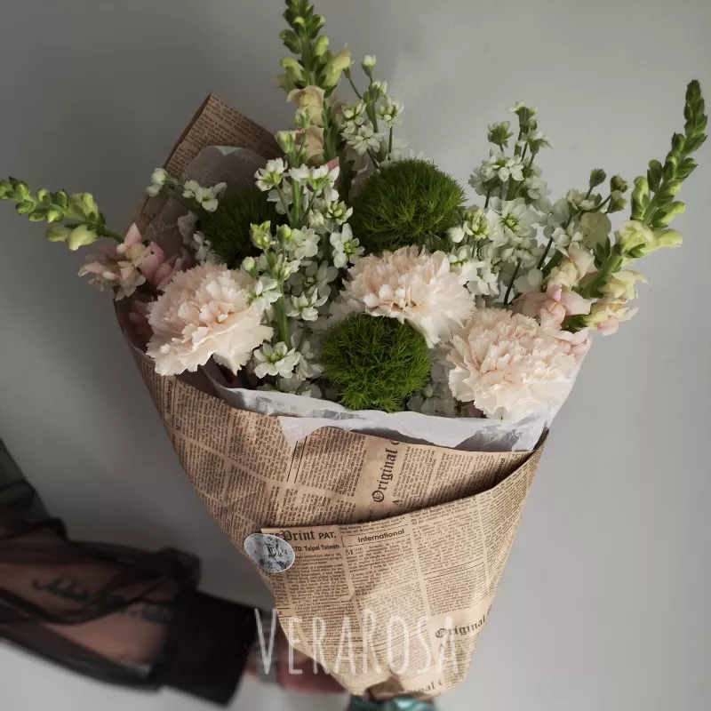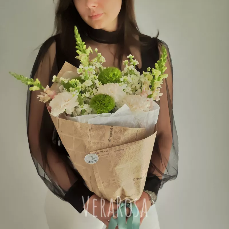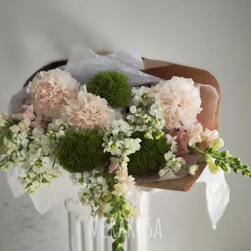 Стильный, летней букет из медовой маттиолы, кремовых гвоздик и изумрудных шариков диантусов. Оформлен в крафт.