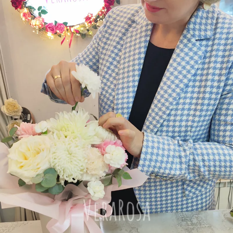 Меня проконсультировали, предложили несколько вариантов сочетания цветов и декорирования. Также удивил факт, что помимо просто сочетаемости флористика обращала внимание на символику растения и цвета.