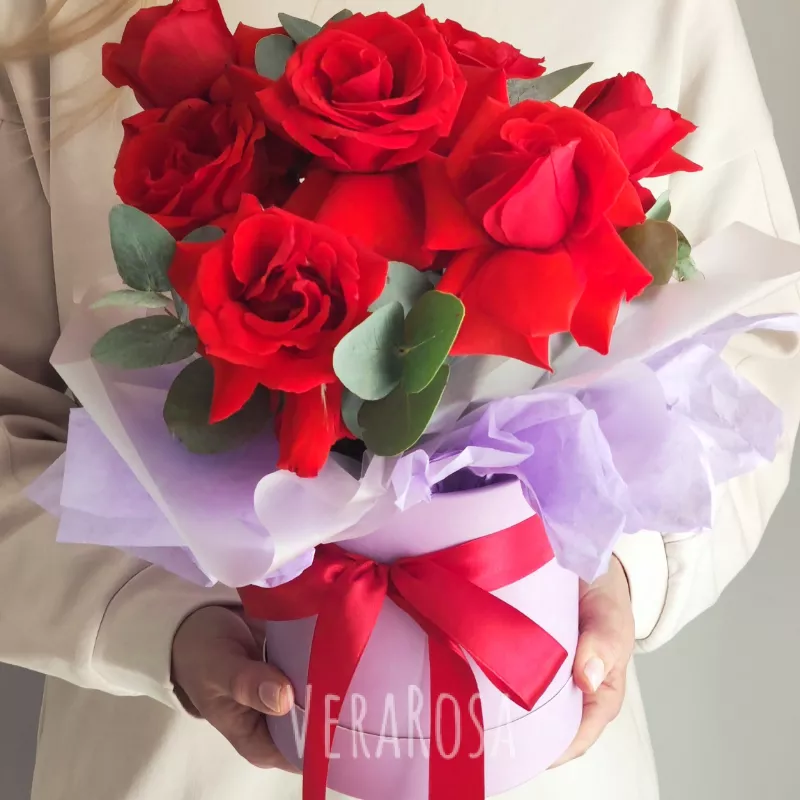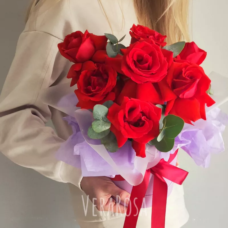 Букет из ярких алых роз, элегантно оформленный в нежную фиолетовую упаковку с яркой красной лентой. Великолепное сочетание насыщенного цвета роз и изящного оформления делает букет идеальным выбором для выражения любви и внимания. Розы в букете сопровождаются зеленью эвкалипта, добавляющей композиции свежесть и завершённость. Этот букет станет прекрасным подарком для самых дорогих и близких людей.