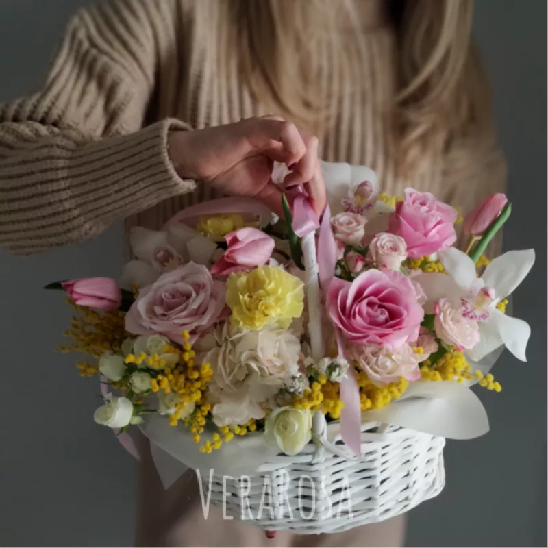 Воздушная корзина, наполненная нежными розами, тюльпанами, благоухающей мимозой и кремовыми орхидеями, парящими подобно бабочкам, украшена атласной лентой.