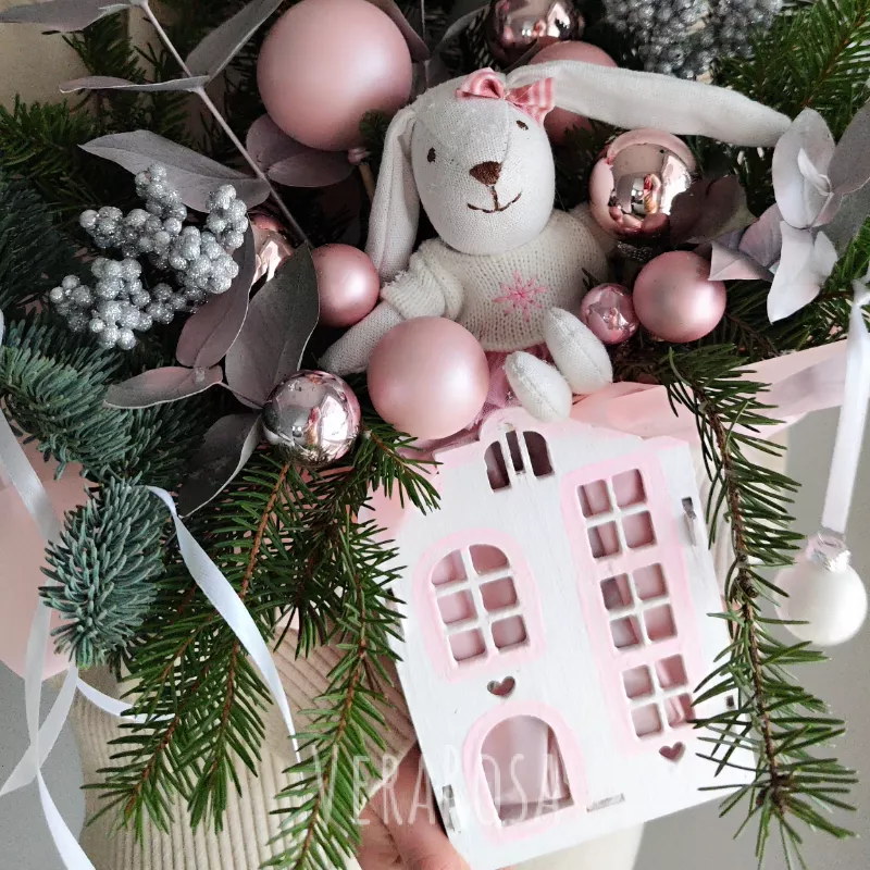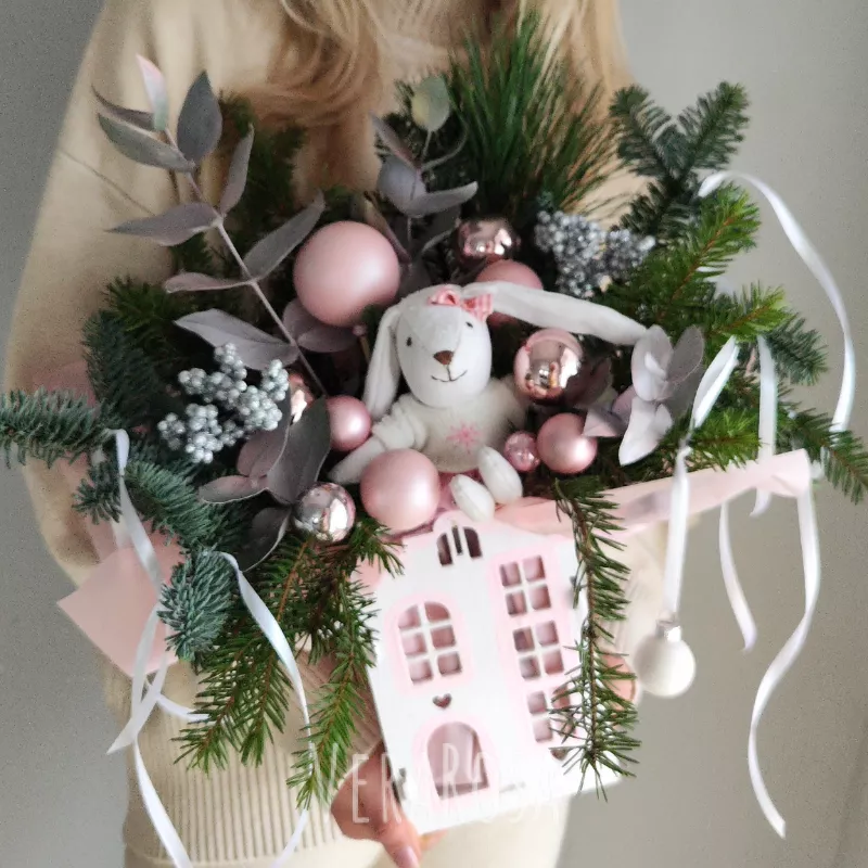 Новогодняя композиция в нежных тонах, включающая милого зайчика, ветки ели и украшения в розовом и серебряном оттенках. Дополненная декоративным домиком, она создает уютную и праздничную атмосферу. Этот букет станет прекрасным подарком к Новому году или Рождеству.