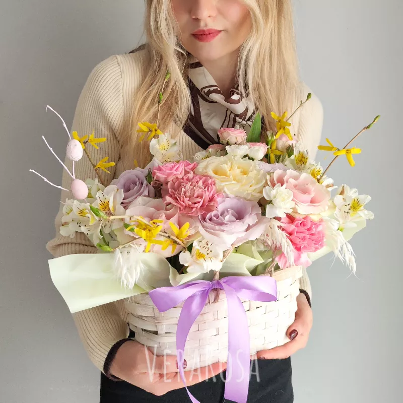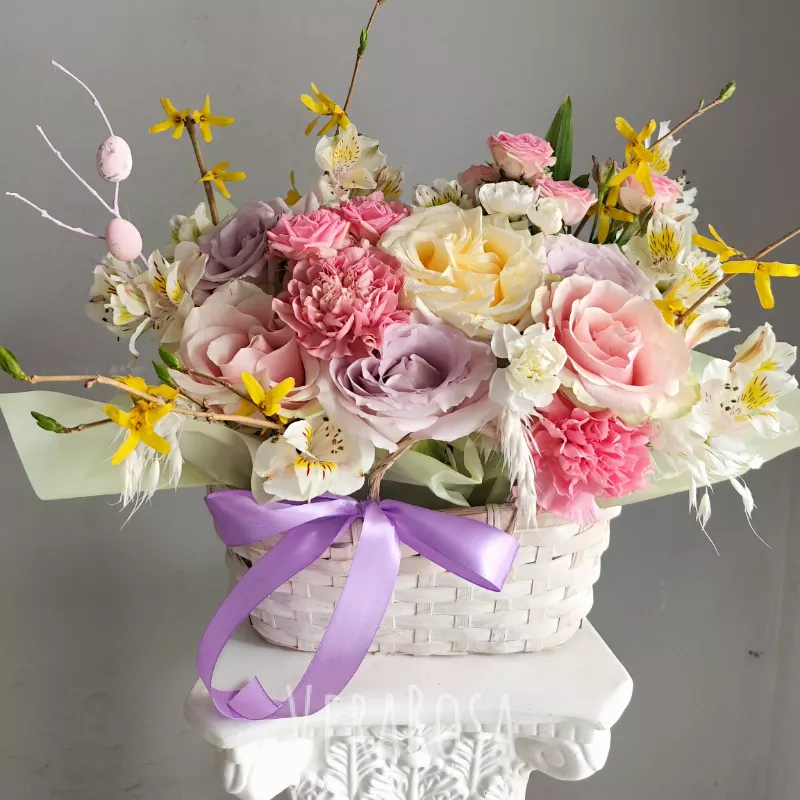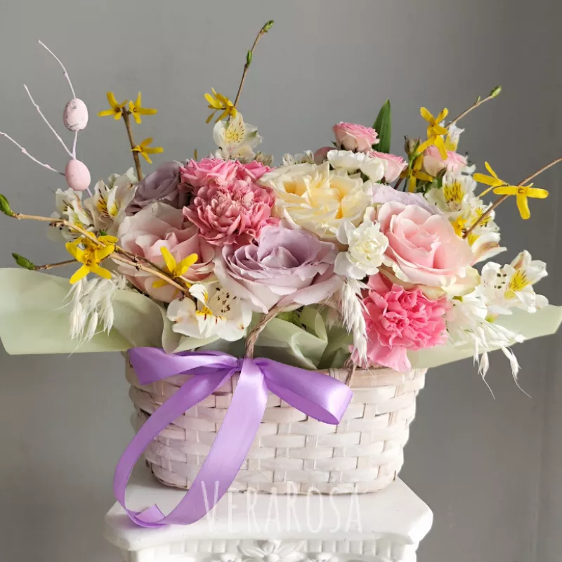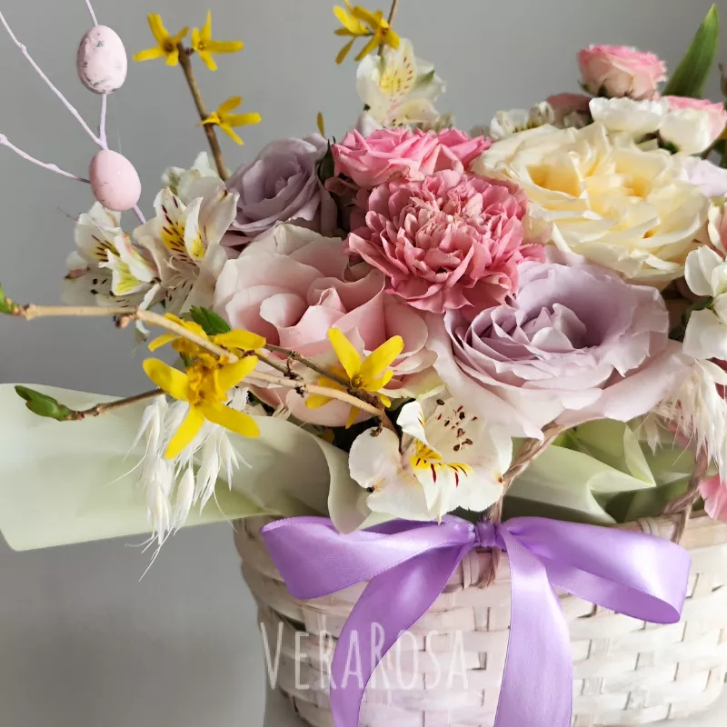 Нежный весенний букет в плетеной корзине, украшенный пасхальными яйцами на веточках. Композиция из роз, гвоздик и альстромерии в пастельных тонах создаст атмосферу праздника и тепла.