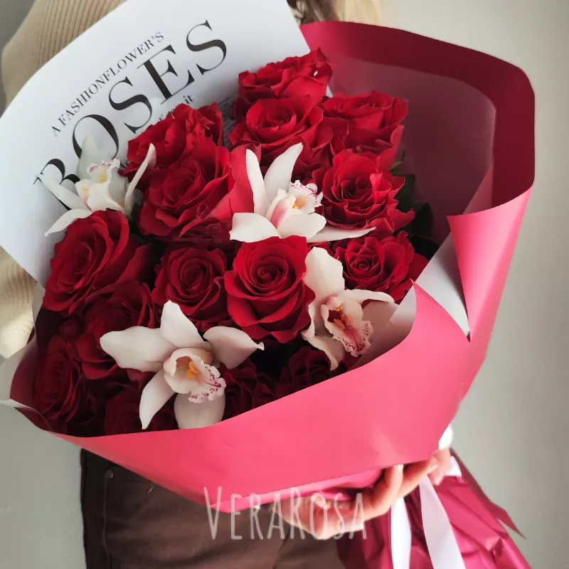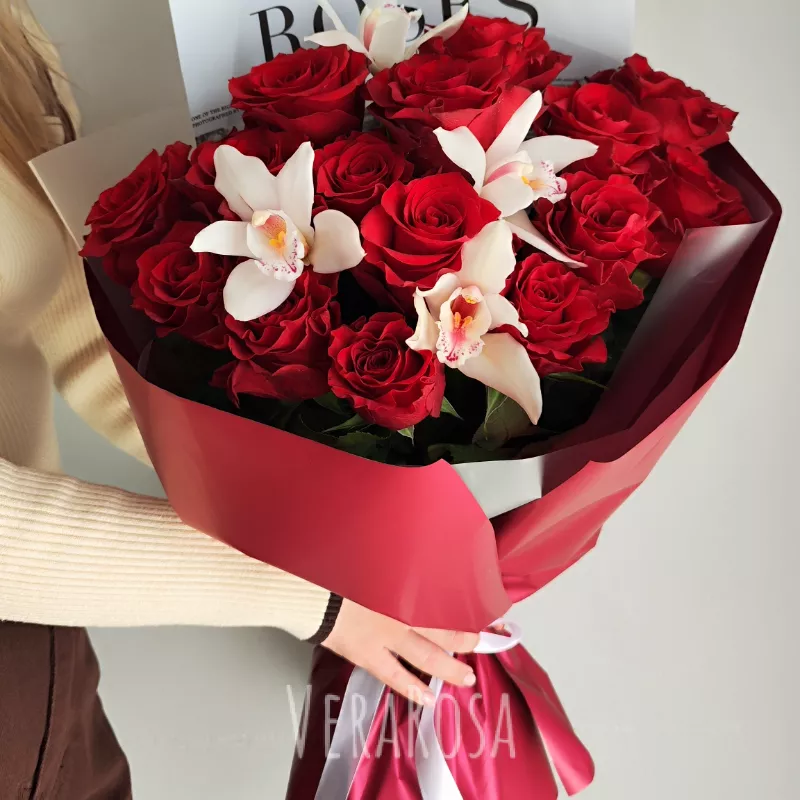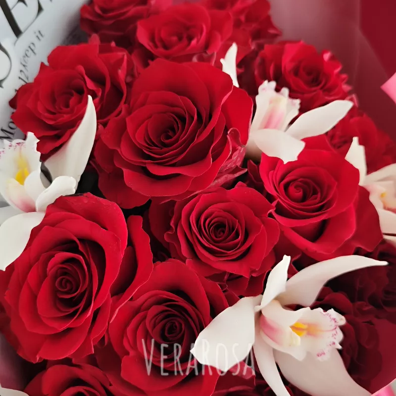 Роскошный букет из алых роз, украшенный нежными белыми орхидеями, символизирует страсть и чистоту. Этот изысканный комплимент создан, чтобы выразить самые искренние чувства.