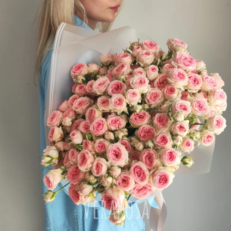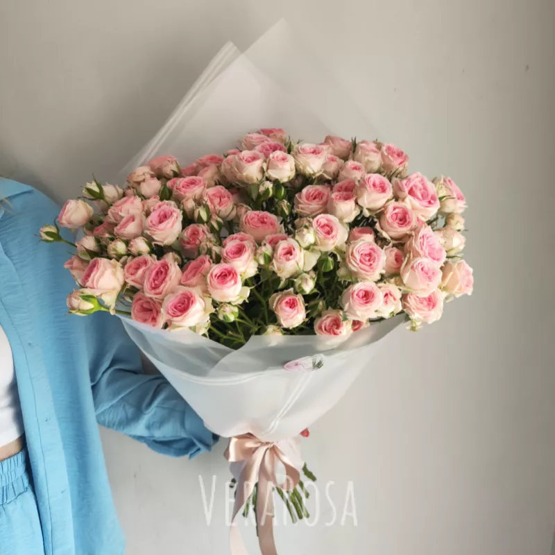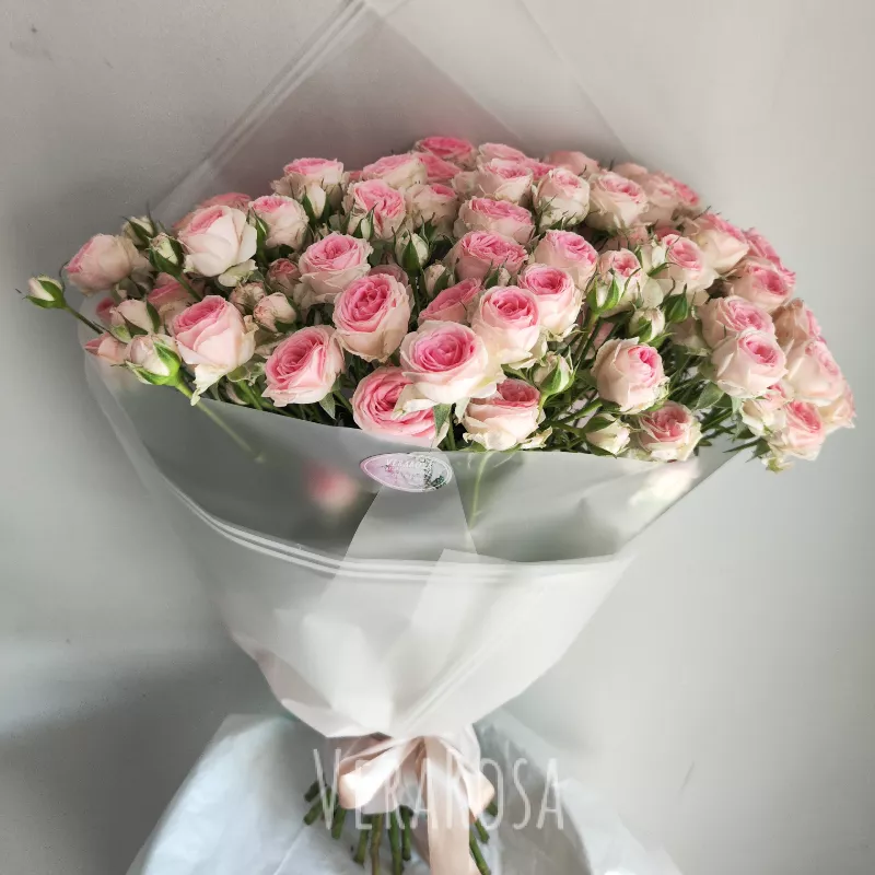 Нежный букет из кустовых роз блекло-розового оттенка. Оформлен в упаковку и атласные ленты.