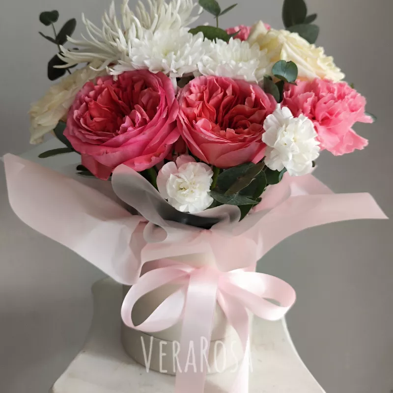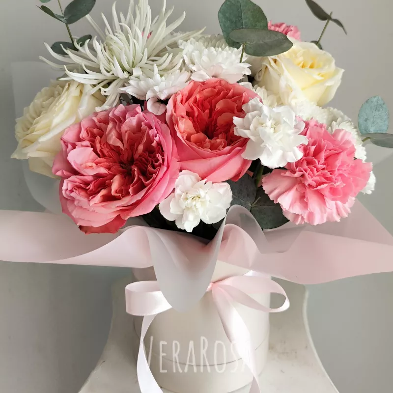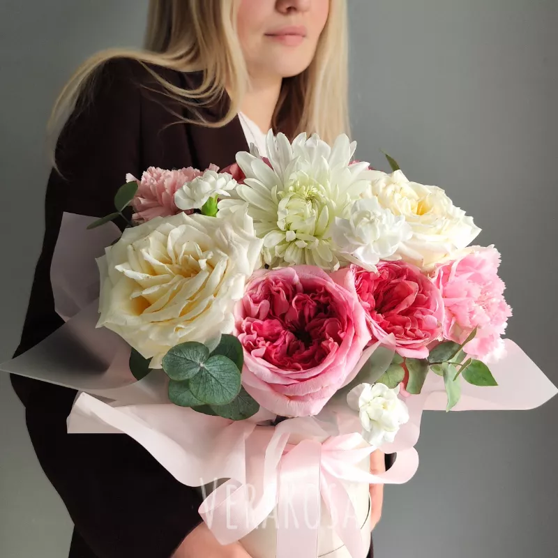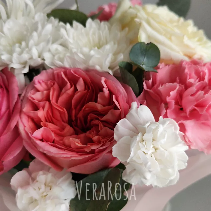 Букет, представленный в нежной гамме розовых и белых оттенков, излучает тепло и элегантность. Он включает в себя розовые и белые пионы, гвоздики, хризантемы и другие цветы, дополненные листьями эвкалипта. Этот букет станет прекрасным подарком для близкого человека или украсит любое событие своей воздушностью и изяществом.