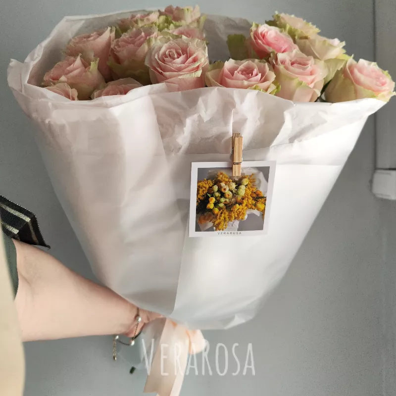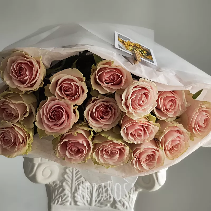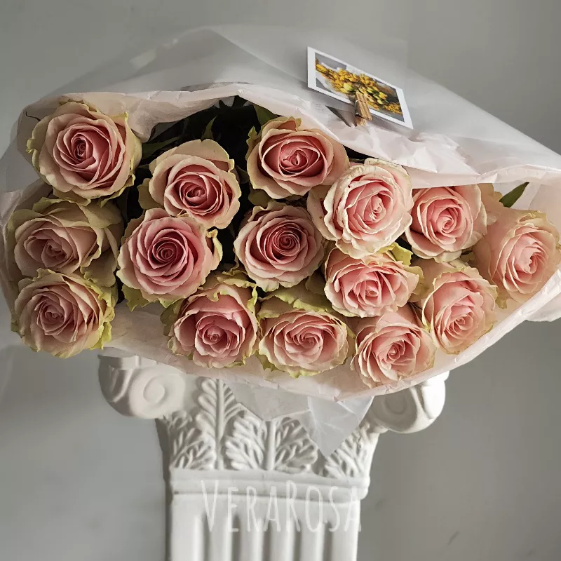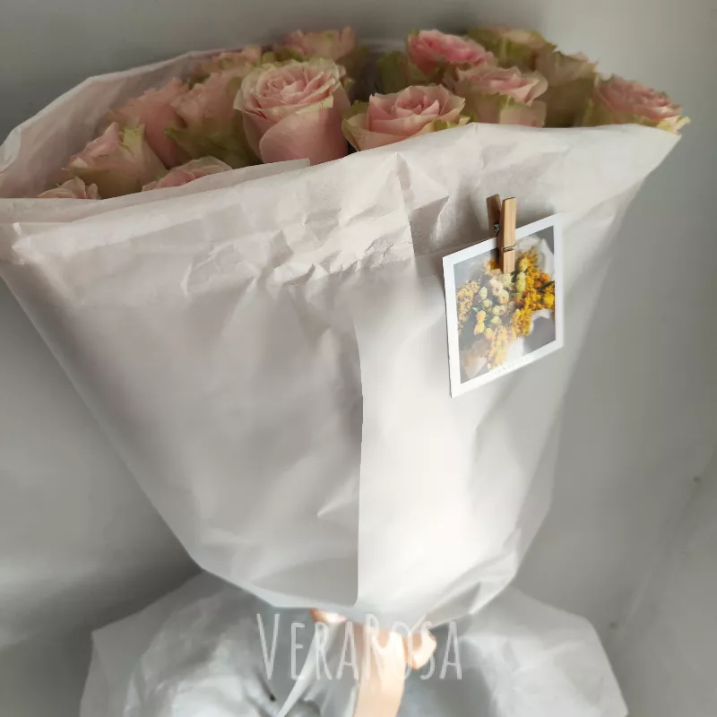 Монобукет из роз в теплых оттенках пудры. Оформлен в упаковку и атласные ленты.