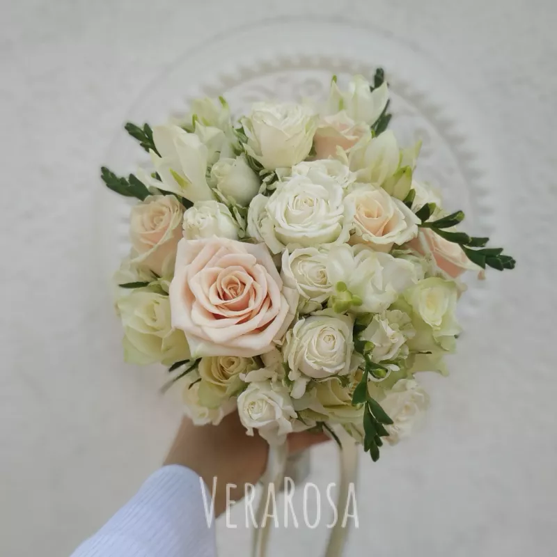 Изысканный букет невесты в оттенках разбеленной фисташки и пудры. Тонкий аромат фрезий придает особый шарм его обладательнице. Оформлен атласными лентами. Бутоньрка в подарок.Обратите внимание, чтобы букет максимально был похож на представленный, оформить заказ лучше всего за 7-14 дней до мероприятия.