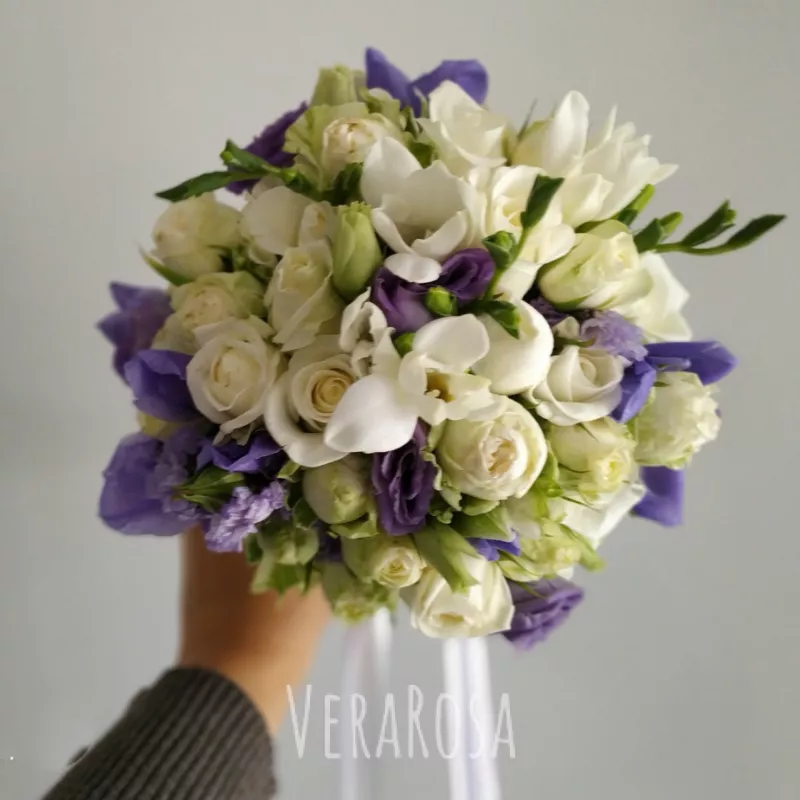 Изысканный букет невесты из пионовидных роз, фрезий и ирисов. Оформлен атласной лентой. В подарок бутоньерка.Обратите внимание, чтобы букет максимально был похож на представленный, оформить заказ лучше всего за 7-14 дней до мероприятия.