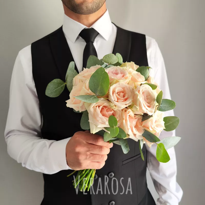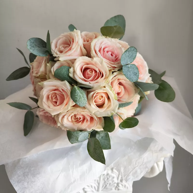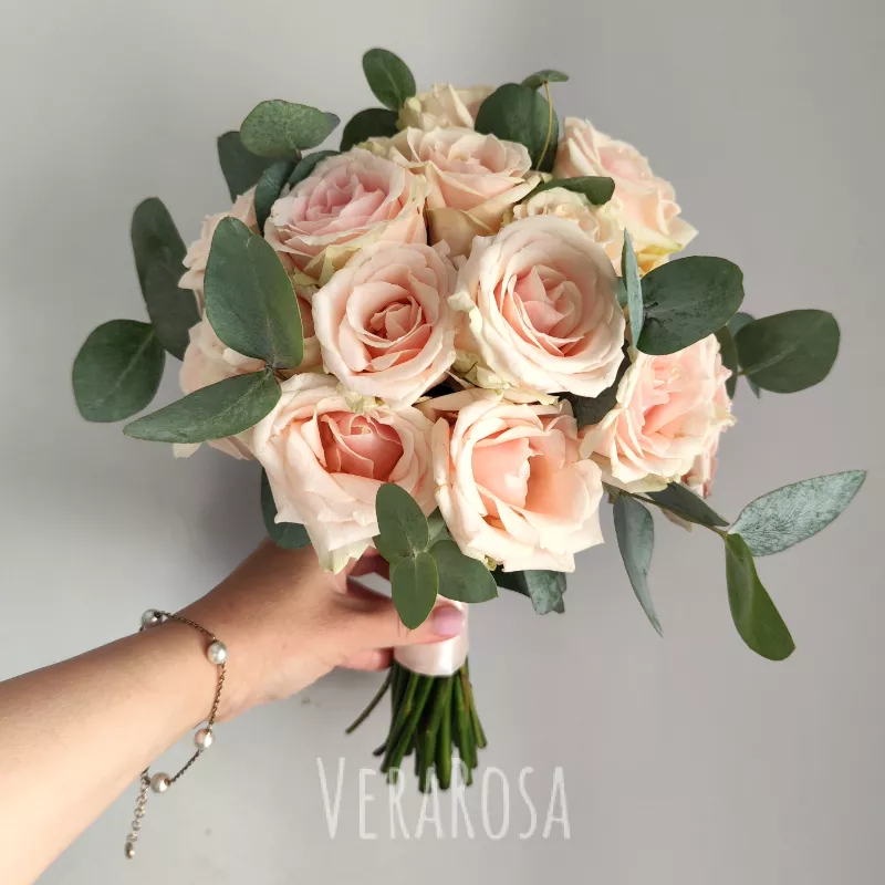 Нежный букет невесты в пастельных тонах. Оформлен атласной лентой.Обратите внимание, чтобы букет максимально был похож на представленный, оформить заказ лучше всего за 7-14 дней до мероприятия.