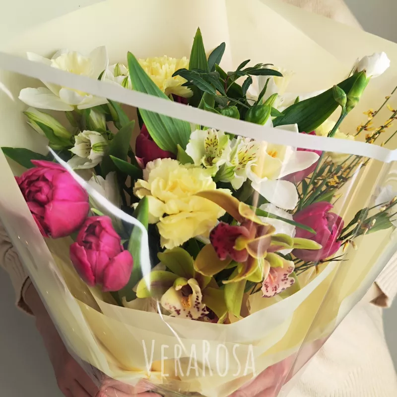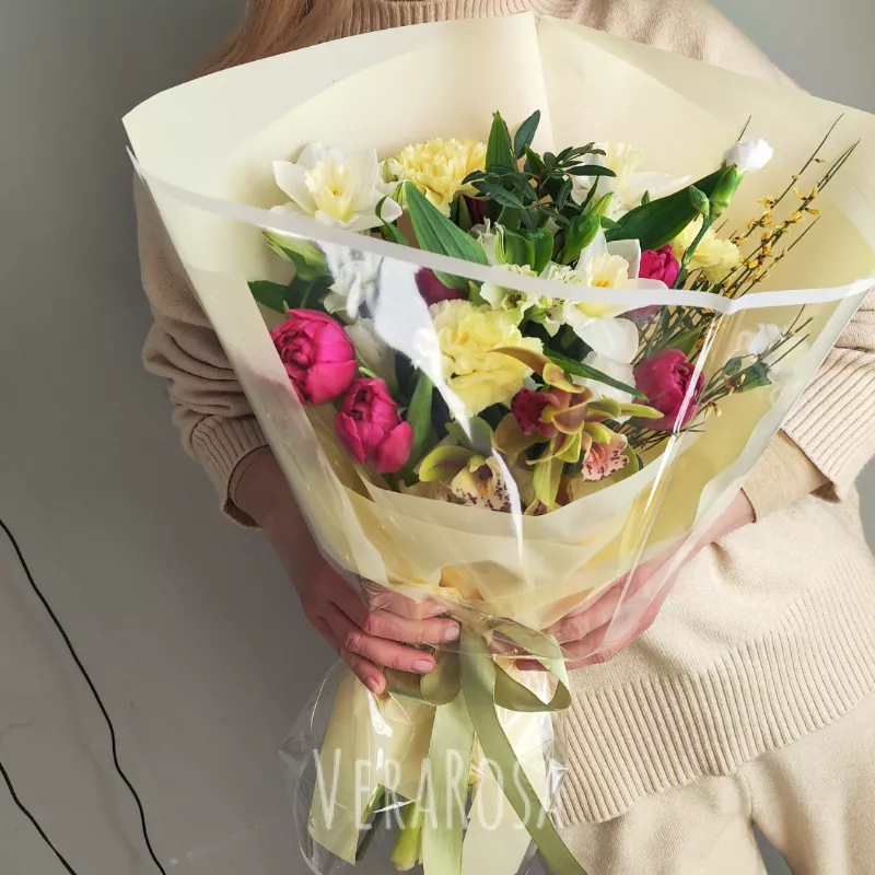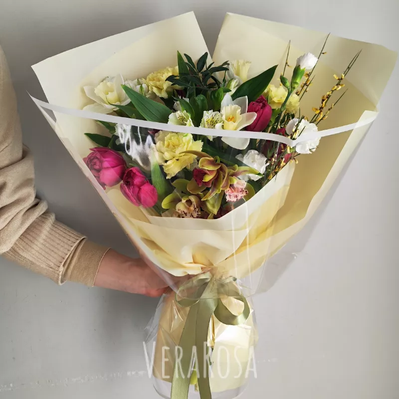 Нежный, весенний букет из тюльпанов, нарциссов, гвоздик и орхидеи. Преобладают сливочные и розовые оттенки, разбавленные яркой зеленью .Букет красиво упакован в светлую бумагу с лентой, что добавляет ему элегантности и завершенности.