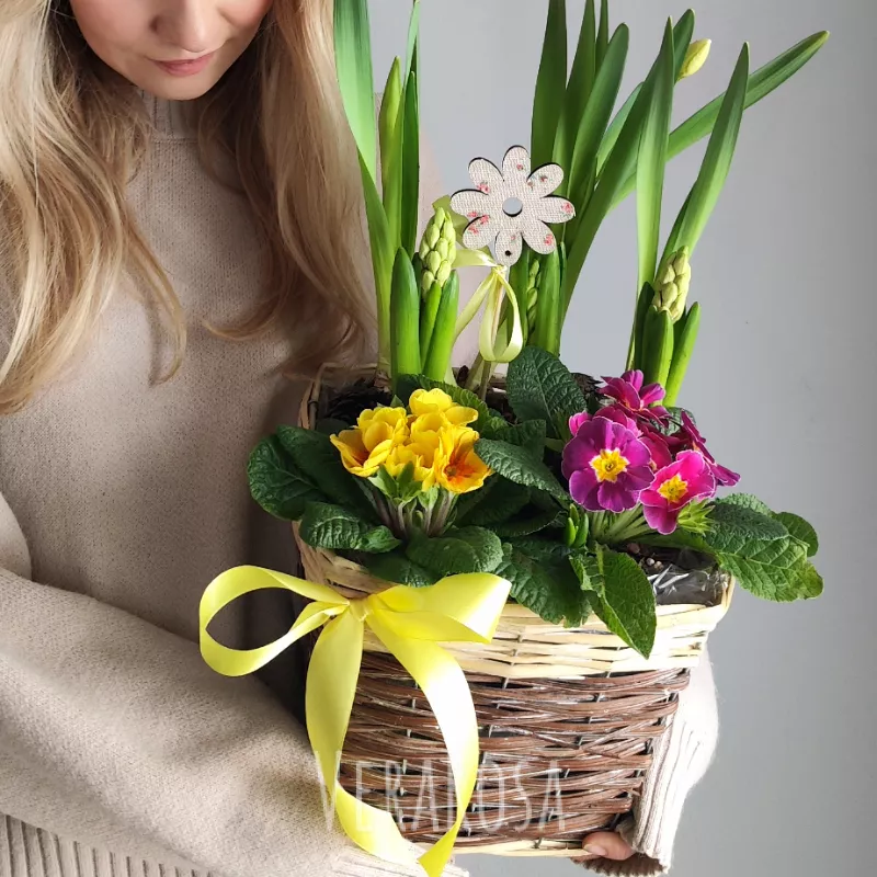 Букет представляет собой нераспустившиеся бутоны нарциссов и примулы желтого и розового цвета в плетеной корзине, украшенной декоративным бантом и цветком. Этот букет олицетворение весны и радости, наполненный нежностью и свежестью. Нежные цветы и изящная корзина создают трогательный образ, идеальный для подарка или украшения интерьера.